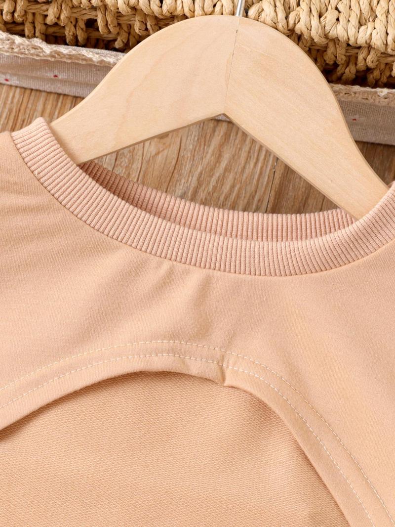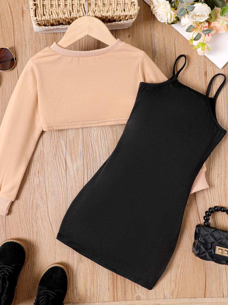 Girl'S Plain High Low Crop Sweatshirt & Cartoon Bear Print Cami Dress Set, Cute round Neck Long Sleeve Pullover & Dress, Kids Fall & Winter Clothes